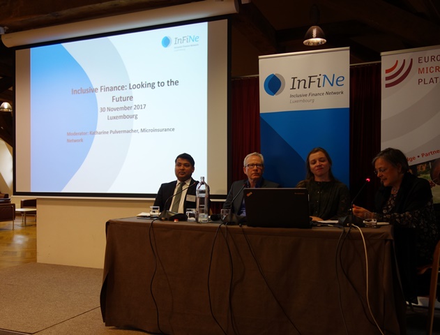 With the global development challenges such as climate change, migration and the growing importance of digital technology, the inclusive finance sector is evolving. Estelle Lahaye, CGAP Financial Sector Specialist, Ian Taylor, Mastercard Vice President Business Development Europe, Government and Public Sector, Sachin Vankalas, LuxFLAG Director Operations and Sustainability and InFiNe.lu Board Member exchanged their views on the future of inclusive finance. The moderator was Katharine Pulvermacher, Executive Director of the Microinsurance Network.
